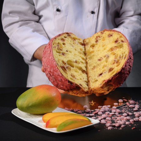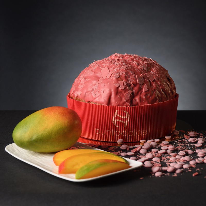 Panettone con cubetti di mango semicandito e perle di cioccolato Ruby