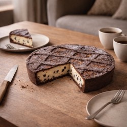 Mangiare questa pastiera è un momento semplice e felice, fatto di sorrisi, silenzi buoni e piccoli gesti condivisi. La frolla al cacao avvolge il morso con note calde e profonde, mentre il ripieno resta morbido, delicato, armonioso. La ricotta è vellutata, il grano leggero, i pezzi di cioccolato emergono con discrezione, sciogliendosi lentamente e regalando una golosità misurata, mai invadente. È un dolce che accompagna senza stancare, che si gusta piano, tra una chiacchiera e un sorso di latte caldo. Ogni fetta racconta una tradizione riletta con equilibrio, fatta di ingredienti scelti e tempo dedicato alle cose fatte bene. Una pastiera rassicurante e contemporanea, capace di trasformare una colazione o una merenda in un ricordo felice.