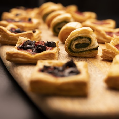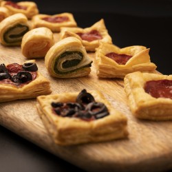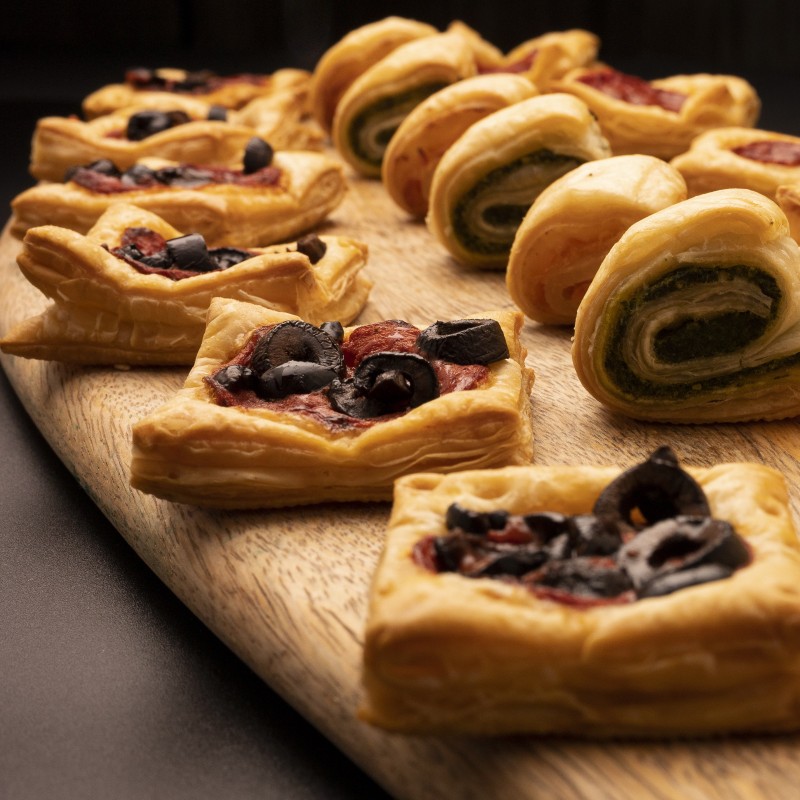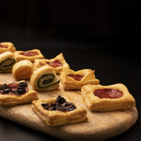 Le pizzette in pasta sfoglia sono piccoli finger food salati della tradizione italiana, apprezzati per la loro croccantezza e versatilità. Realizzati con un involucro di pasta sfoglia rigorosamente al BURRO, dorata e friabile, possono avere diversi ripieni, che variano in base ai gusti o alle tradizioni regionali.